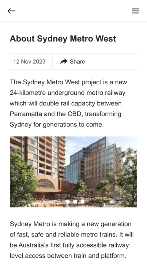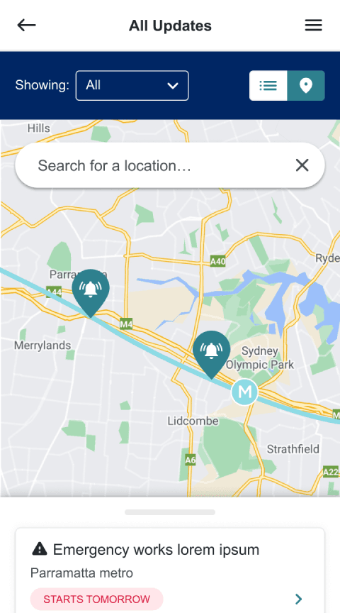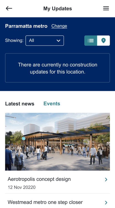 The Sydney Metro Connect Mobile App offers community members a simpler way to stay up to date about project works in their neighbourhood. Combining multiple feeds and customizable user profiles, the app was planned, designed and built from the ground up to keep users informed about project milestones and construction that may cause disruption to their services.